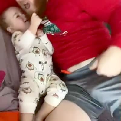 A man and a baby boy lay on the bed and a woman tells the boy to get his beard and he grabs it and pulls and he and the man both yell and he let's go and kicks the man in the groin in the bedroom.