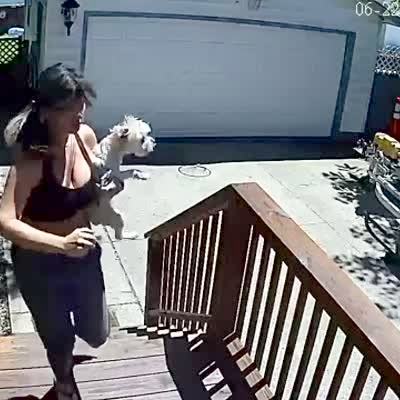 A woman lets two terrier dogs out onto a driveway, then a deer runs after the dogs, and the woman picks up one dog and gets them both back in the house. Security footage, no audio.