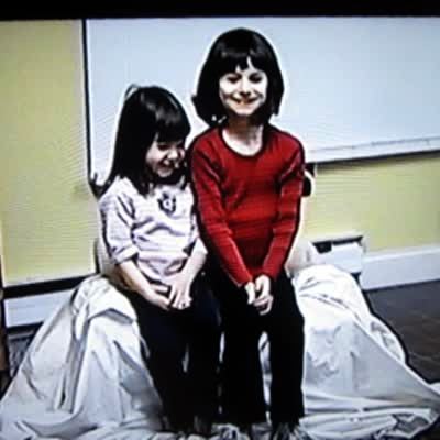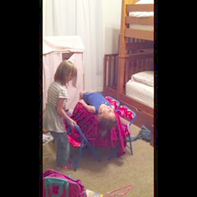 A young girl does a magic trick that makes it look like she's levitating under a blanket. A tot girl pulls off the blanket at 1:15 to reveal two fake feet and the girl glares at her.