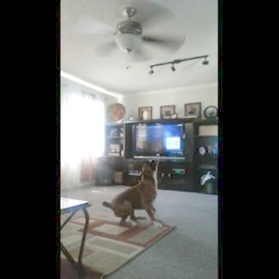 A dog barks at a ceiling fan, jumps up, and turns the light on.