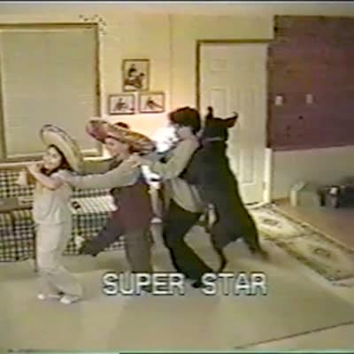 Three siblings form a conga line with their dog and dance around the living room indoors.