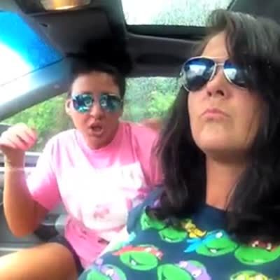 Two women dance to a pop song (Blurred Lines) in a parked car and one falls out at :11.