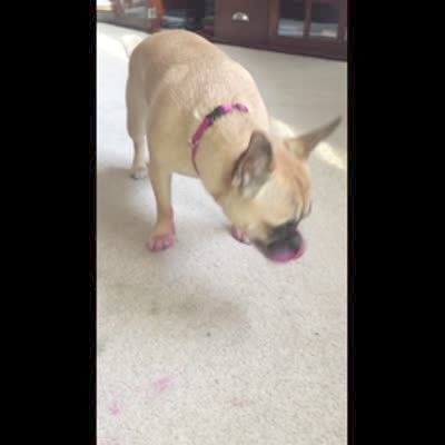 A guilty dog gets shamed for getting into red lipstick, covering it's mouth, paws and the carpet.