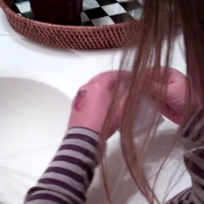 A girl shows that she just lost her first tooth indoors and when she takes it out of an envelop, it nearly falls down the bathroom sink drain, but her dad catches it.