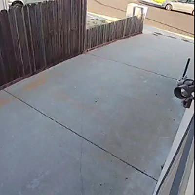 A pumpkin rolls away from a woman down a driveway into a road and the woman chases after it. Security footage.