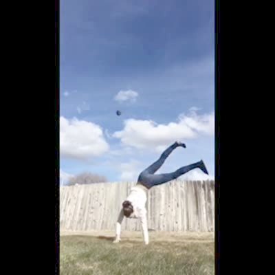 A teen girl does a cartwheel. Her shoe comes off and goes over the fence behind her.