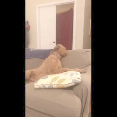 A man does the what the fluff challenge for a dog when he disappears the dog is startled and looks for him.