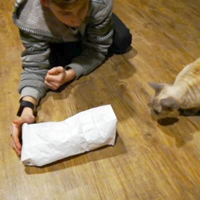 A cat plays with a paper bag on the floor of the living room, then she runs into it and slides under the couch and loses the bag.