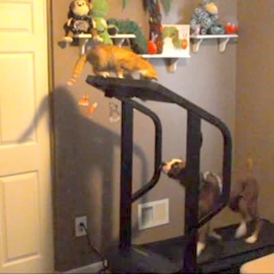 A cat messes with the controllers on a treadmill, speading it up, while a boxer dog walks on it. A woman laughs and has to lower the speed for the dog.