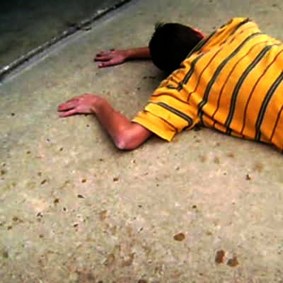 At 0:33, a man falls to ground while hanging from wood beam of unfinished structure. He's trying to slowly lower himself down with rope.
