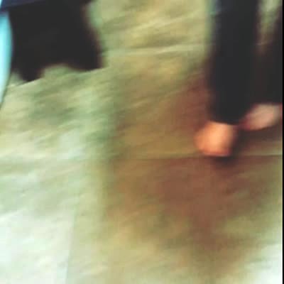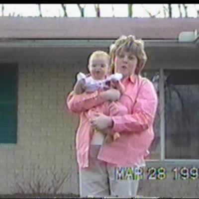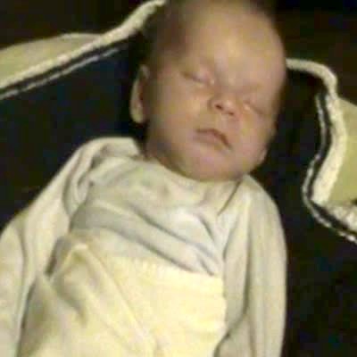 A woman takes a baby into its crib. She lowers him to the mattress, but leans too far, and falls into the mattress herself. She then pushes herself out of the crib. Security camera footage.