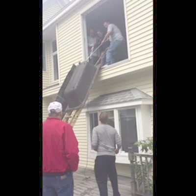 A group of men stand in a window frame of a house outdoors and lower a bathtub down a ladder with a rope as other men stand at the bottom to receive it. The bathtub slips and falls to the ground and breaks a window at the bottom of the house.