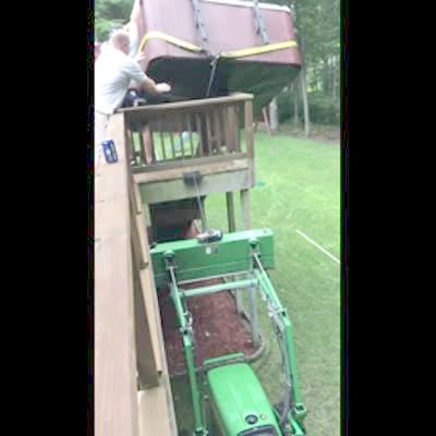 A family tries to lower a hot tub on to a lawn from a second story, but they drop it and it crashes to the ground.