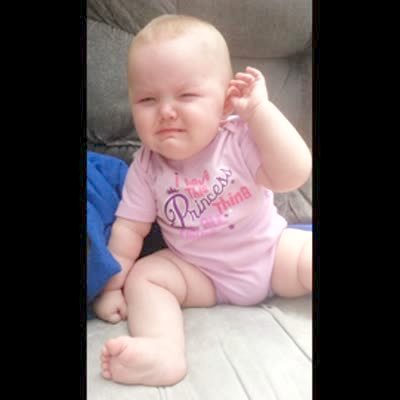 A woman asks her baby daughter why she's not crying and the baby girl pretends to cry by quivering her chin and lower lip repeatedly.