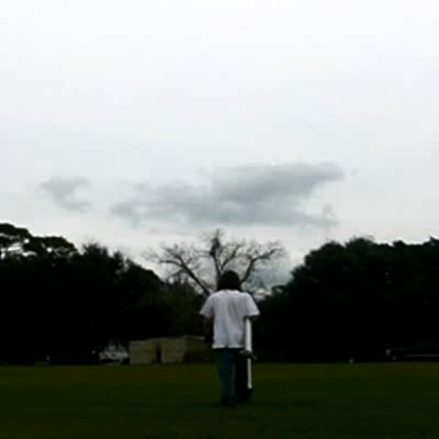 A senior man stands in the middle of a green field. A young boy flies a drone over his head and lowers it over his head then drops it by the side of his face and the drone blades slash at the old man's neck and throat.
