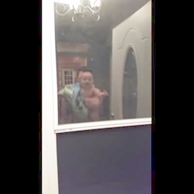 A man holds a tot boy in front of a glass door and raises him up and down to play peek-a-boo with their reflections. At the end the man puts on a scary mask before he lowers the boy to show his own face in the reflection again. He lowers the boy and reveals his face with the mask and the boy makes a scared face.