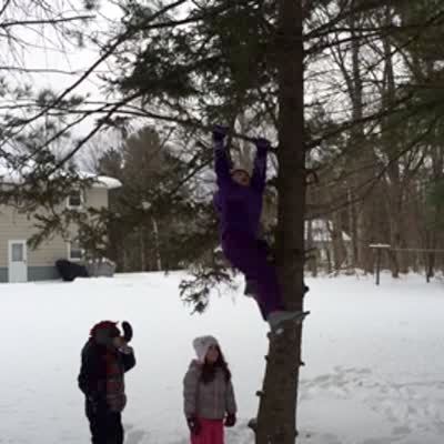 A girl becomes stuck against a tree when she hangs from a branch outdoors, then falls and her shirt gets caught on a lower branch.