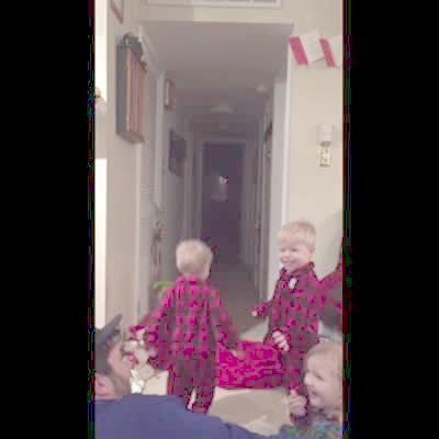A man raises and lowers a blanket in front of himself before the blanket falls and he disappears. His twin tot boys jump up, look around the blanket for him and whine when they can't find him. Their mom distracts them while the man makes himself reappear.