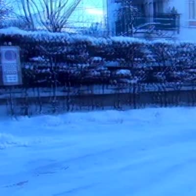 A man runs into a lowered barrier gate and flips over it in the snow outdoors.