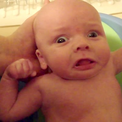 Newborn baby boy gets wide-eyed when being lowered into baby bath.