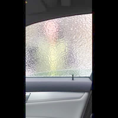 A car window lowers to reveal a sheet of ice that was frozen to the window. A girl touches the ice and it shatters and breaks into the car.