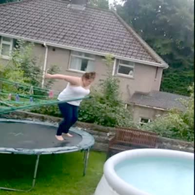 A woman jumps on a trampoline and tries to jump into a pool, but falls and face plants into the pool, while her lower half is still out of the pool.