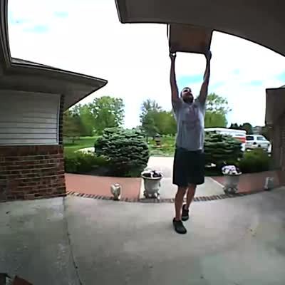 A man walks out into the driveway to pick something up and then walks back to the garage, but hits his face on the door because it's not up all the way. Home security camera. No audio.