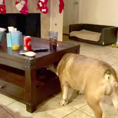 A dog sticks its head into the lower tier of a coffee table to get popcorn, but its head does not fit in the gap. It pushes the table and slides it across the floor.