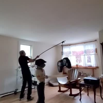 Two men push a couch off the roof of a building and hang it from a rope, and it swings against a window and breaks it, and a woman inside says she is fine.