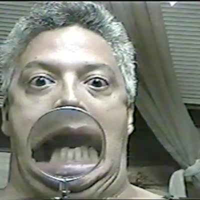 A woman in a living room holds up a magnifying class and sings a song called Bucky Boy and it makes her mouth look like she has the big mouth filter.