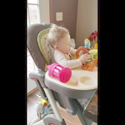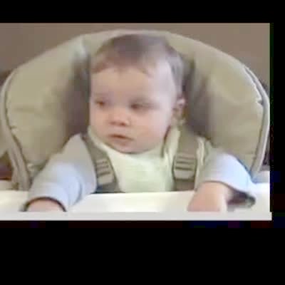 A tot boy cries when his mom tries to get him to say "mama", but stops and smiles when she asks him to say "daddy" as he sits in his high chair.