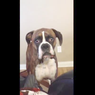 A bulldog mix dog in a living room howls a noise that sounds like 'Mama.'