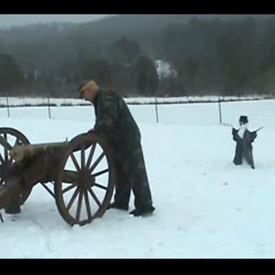 Senior man in a Confederate Civil War uniform dresses a snowman on a snow covered field in a Northern Civil War soldier uniform. He sets it up in front of a Civil war cannon, calls it a "Yankee Snowman," fires the cannon, and blows the snowman up.