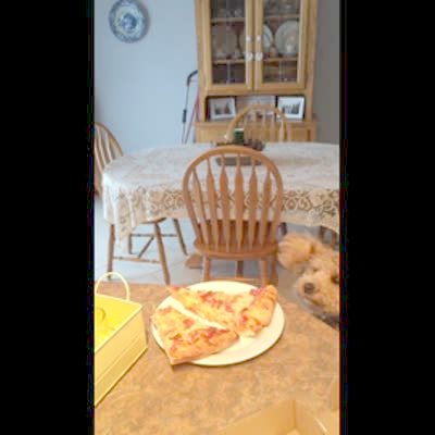 A small dog jumps up and down at a plate of pizza on the counter and manages to grab one of the pieces.