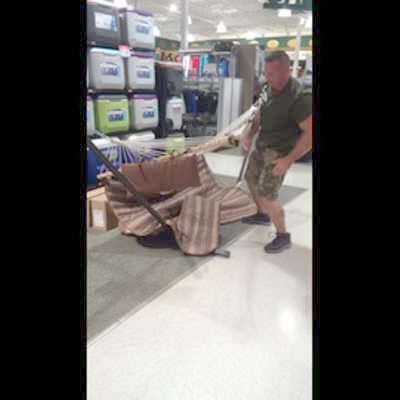 A man struggles to climb into a hammock in a store indoors. He makes several attempts to get on the hammock and falls off each time. He manages to get on in the end, but then still falls off.