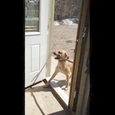 A man gets his overalls stuck on a door handle as he tries to leave the house, so he calls his wife but manages to break free. Security footage.