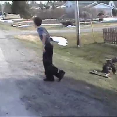 Young boys ride a child's scooter together down the street. One falls off, hits a water puddle and gets drenched / soaked. NO HEADS - short clip.