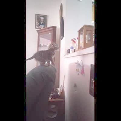 A kitten cat jumps off the back of a chair, falls short of the counter, and to the ground.