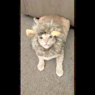 A tabby cat wears a lion's mane costume, mews, and attacks the camera.
