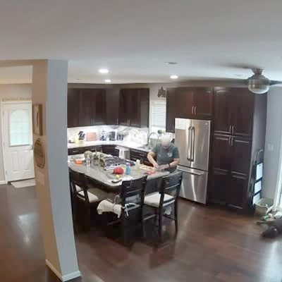 A woman tells a cat to get off of a kitchen counter, then a labrador retriever puppy dog jumps on the counter and opens a drawer while an appliance falls off the counter. Security footage.