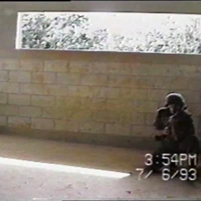 Soldiers made a wall out of duct tape across the door. One soldier runs into it and falls. Military, practical joke. Army.
