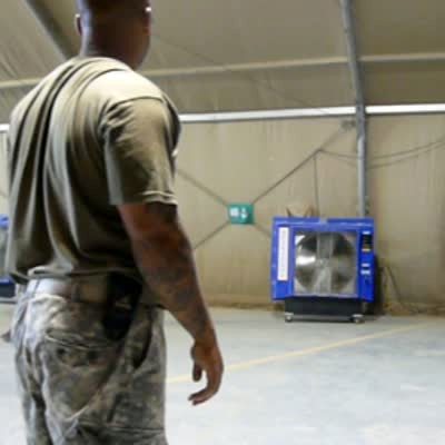 Soldier trains in a roll over simulator, he's dizzy and can't get out. He falls over face first. Military.