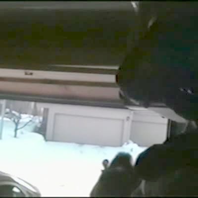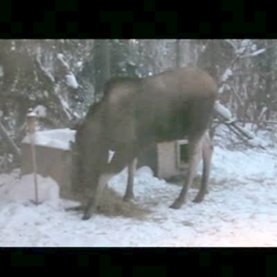 Moose in man's backyard gets its head caught in the dog house, moves its head around until it shakes the small wood house off its head. Winter, snow. There's another moose there.