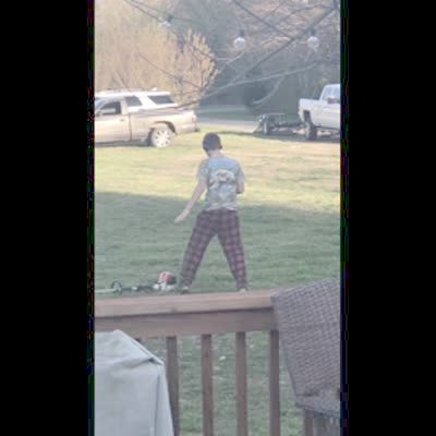 A teen boy dances in the yard when he is supposed to be mowing the lawn, his mother secretly films and laughs. He turns and sees her and is embarrassed he got caught.