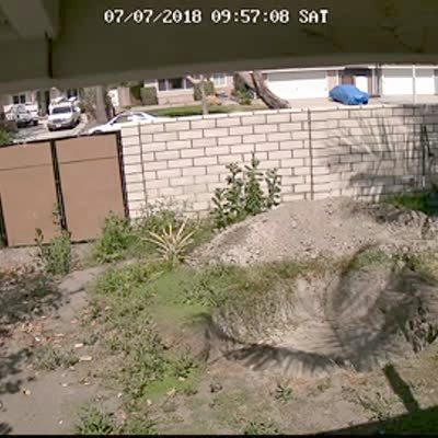 A man mows a lawn and falls into a large hole in the yard. He looks around, confused, then gets back up and continues to mow. Home security footage.