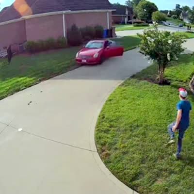 A car rolls down the driveway towards a neighbor's house when a man forgets to put it in park as he runs inside his house. His young daughter yells for him from inside the car and he runs back to it and stops it.