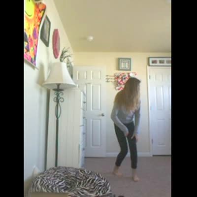 A young girl dances indoors until she sees her neighbors watching her off camera.