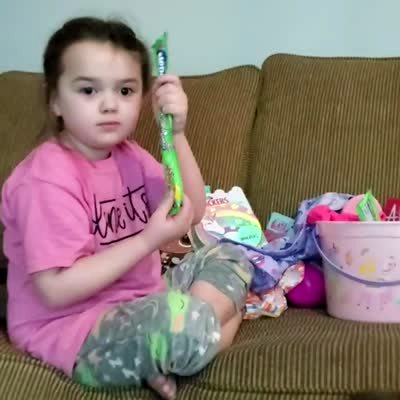 A tot girl holds a Nerds rope in a living-room and a woman asks what they are and she says "turds."