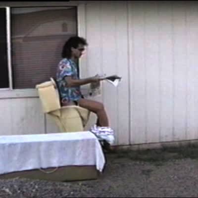 A man sits in a lawn chair outdoors and explains he's going to do an ice bucket challenge while a teen boy and a young man stand on a tractor behind him with a large metal tub of water. The man in the lawn chair pretends to read a newspaper as they struggle to tilt the tub of water, but when they do, it crushes the man and the camera cuts away but cuts back to show the man drenched on top of his broken lawn chair.