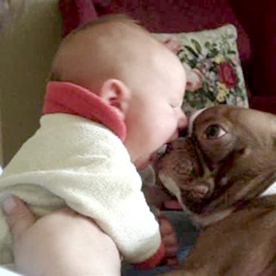 Man and black & white dog lay on the couch together. When man bites the dog's paw, dog bites the man's nose.